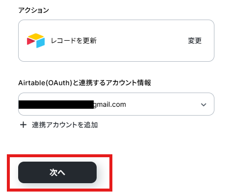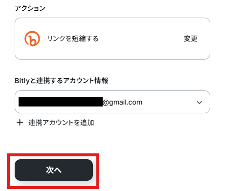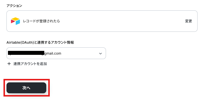 アクションはデフォルト設定のまま、アカウント情報は、連携したいアカウントが選択されているか確認してください。確認出来たら「次へ」をクリックしましょう。