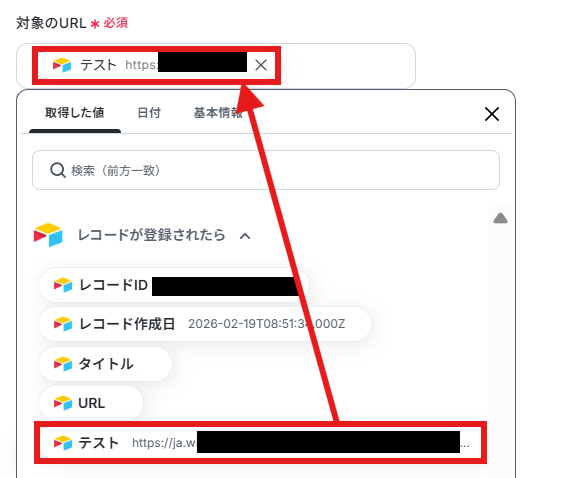 「対象のURL」は前ステップで取得した値から入力しましょう。 取得した値を活用することで、固定値ではなく、トリガーが実行されるたびに最新の情報が反映できます。