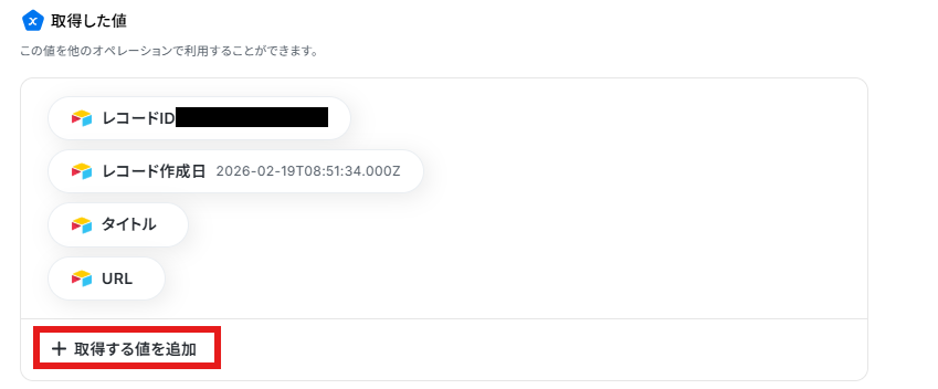 取得した値の下部にある、「+取得する値を追加」をクリックします。