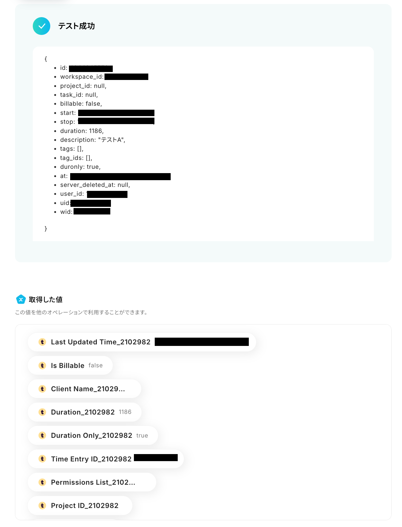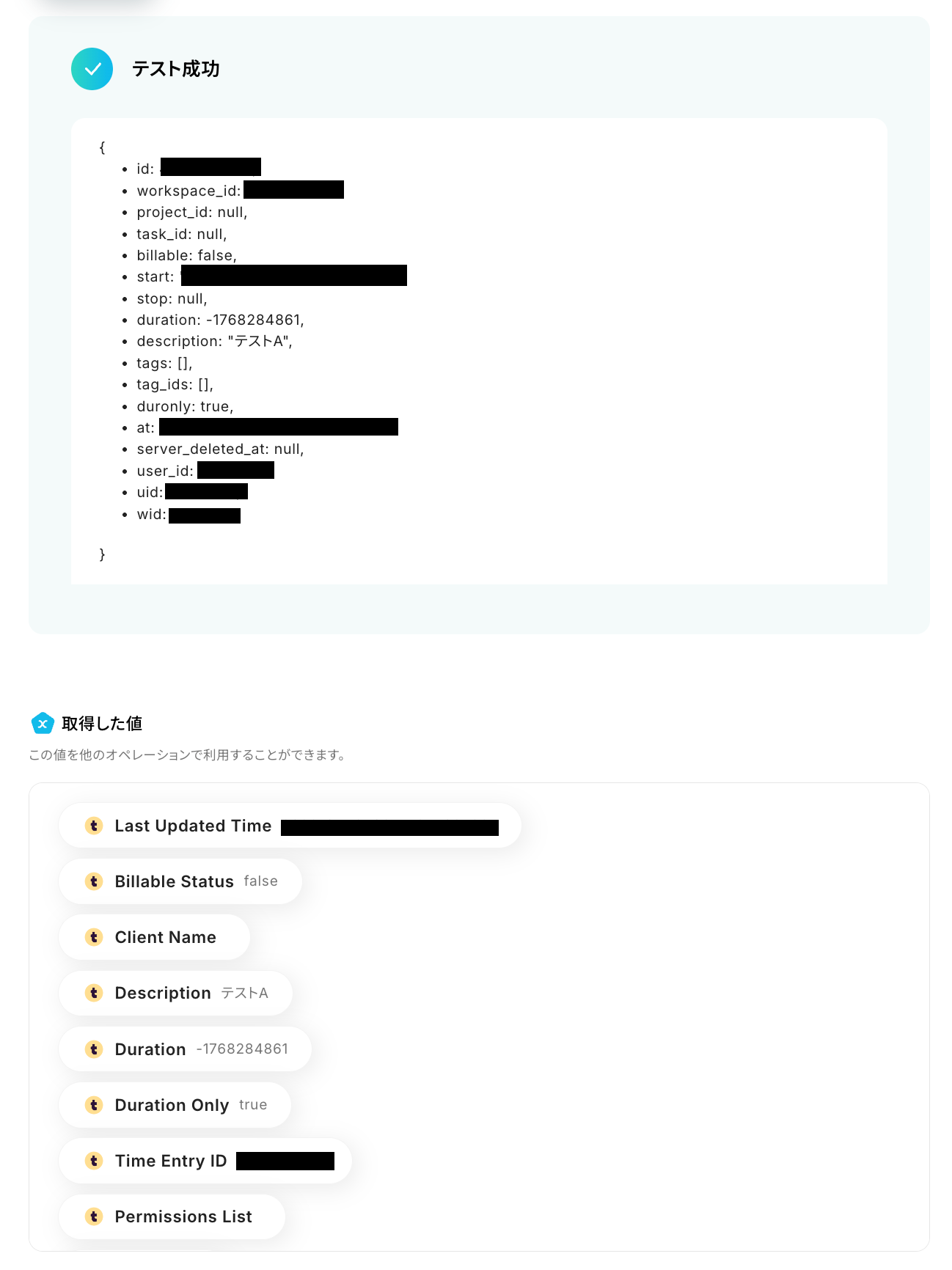 「テスト成功」と表示がされたら、Time Entryの情報が取得した値に反映されています。