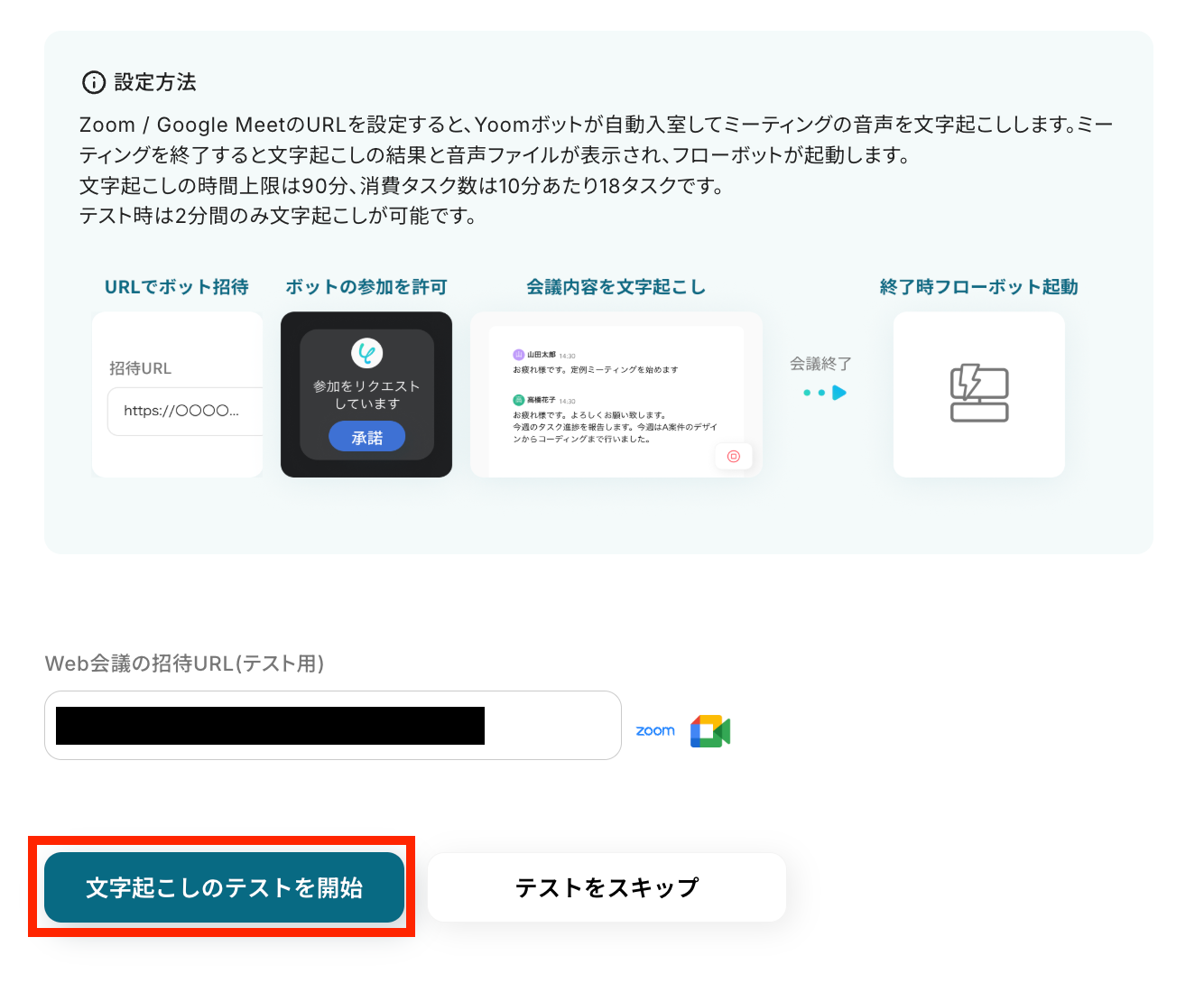 Yoomの設定に戻り、会議をするURLを登録して、「文字起こしのテストを開始」ボタンを押します。