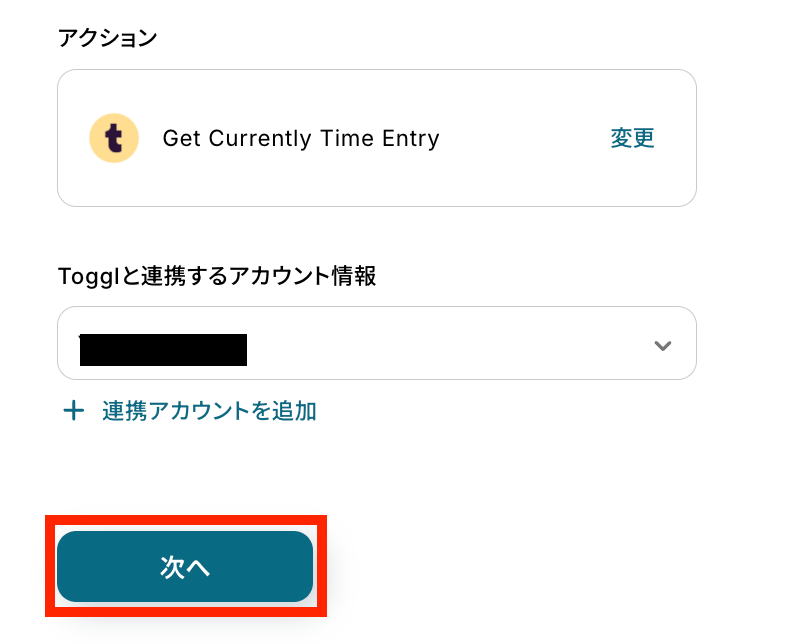 アクションは「Get Currently Time Entry」のままで、アカウント情報を確認します!