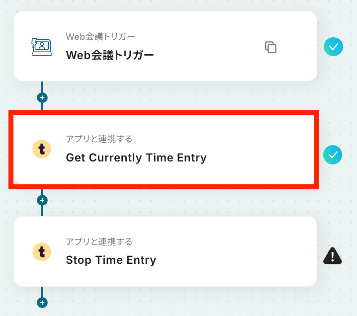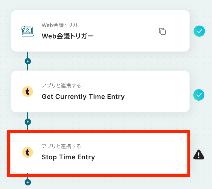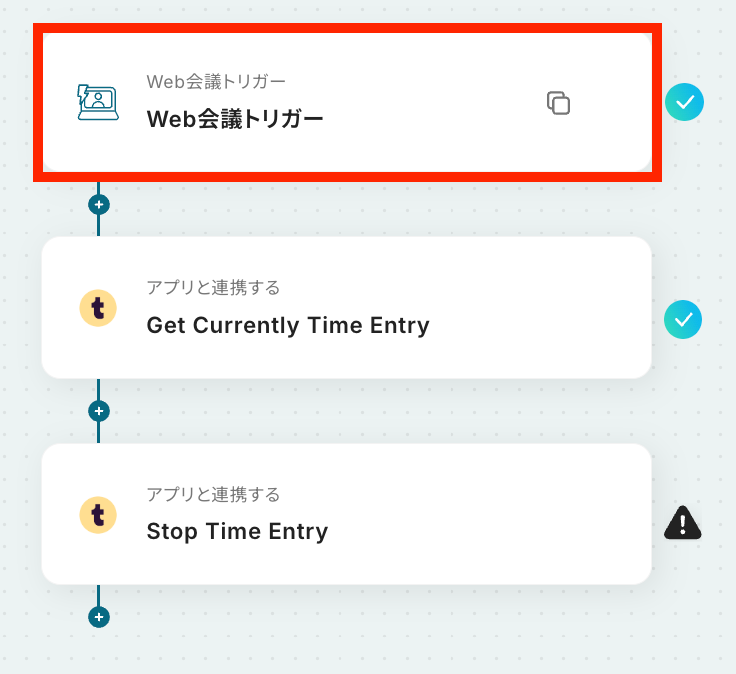 はじめに、TogglをYoomと連携します 次に、トリガーでWeb会議機能を選択し、Web会議が終了したらフローが起動するように設定します 次に、オペレーションでTogglを選択し、「Get Currently Time Entry」アクションを設定します 最後に、オペレーションでTogglの「Stop Time Entry」アクションを設定し、取得したタイムエントリーを停止させます ※「トリガー」:フロー起動のきっかけとなるアクション、「オペレーション」:トリガー起動後、フロー内で処理を行うアクション■このワークフローのカスタムポイント