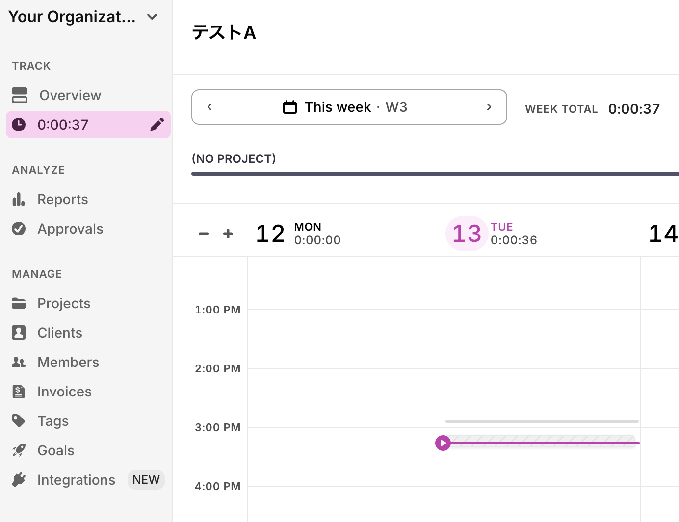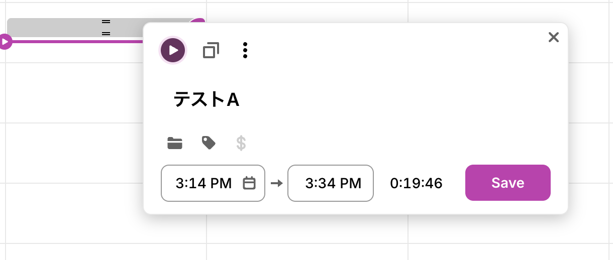 Toggl上でテスト用のTime Entryを作成しましょう。今回は下記の「テストA」を使用します!