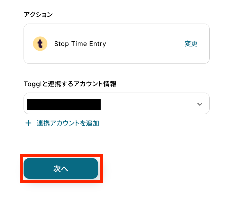 ステップ5:Togglのアクション設定 これまでに取得した値を使用して、TogglのTime Entryを停止する設定を行います。 最後の赤枠をクリックしましょう!