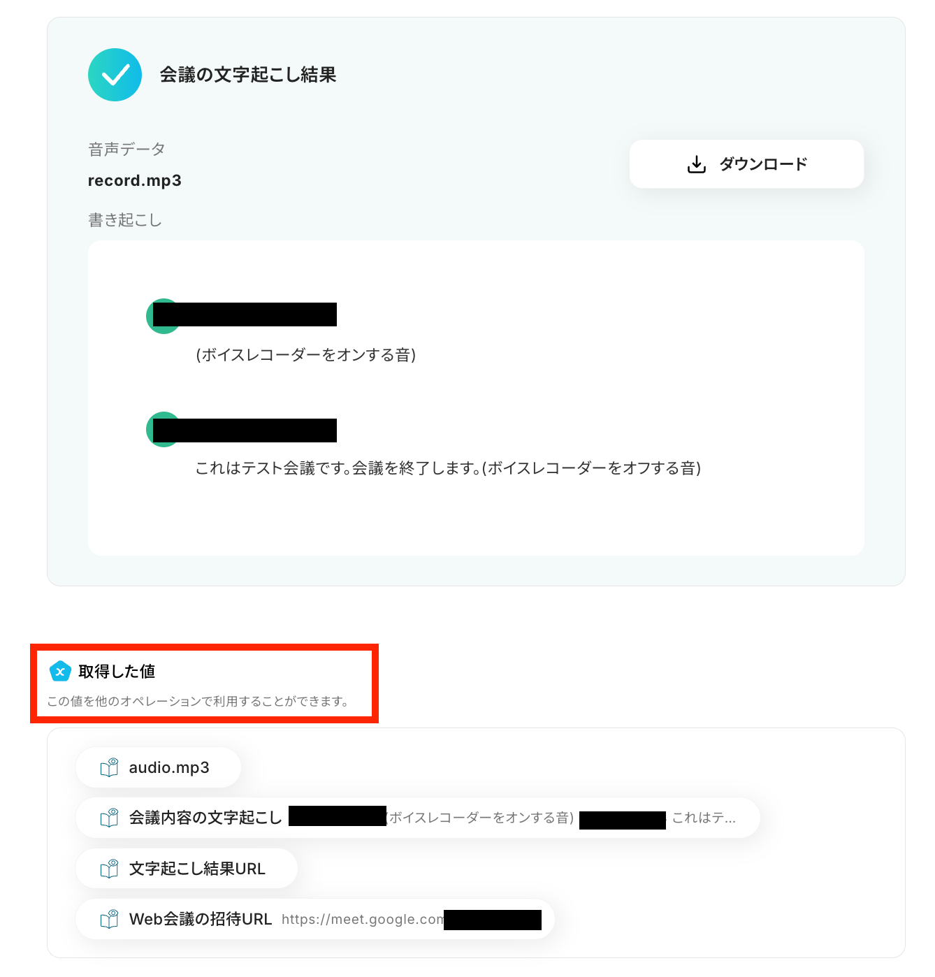 文字起こし結果と取得した値 が確認できたら、「保存する」ボタンを押しておきましょう!