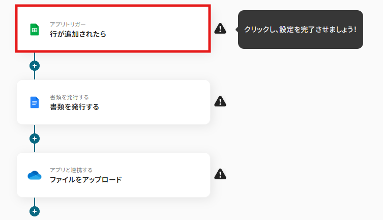 右に「!」が表示されているアイコンを上から順番にクリックし、オペレーションを設定します。1) まずは「アプリトリガー 行が追加されたら」をクリックしてみましょう!