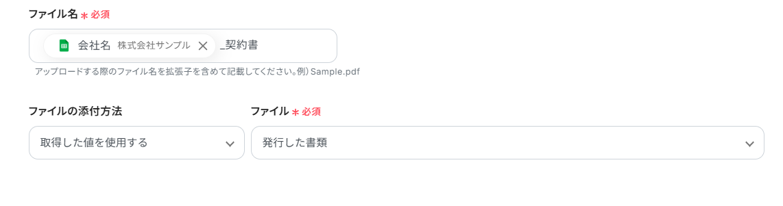 3) 必須項目を入力します。 ドライブIDや格納先フォルダのアイテムIDは先ほどのGoogle スプレッドシートIDと同様にボックスをクリックすると連携済みのIDが表示されるので保存したい場所を候補から選択してください。 ファイルは「発行した書類」を選択してテストします。