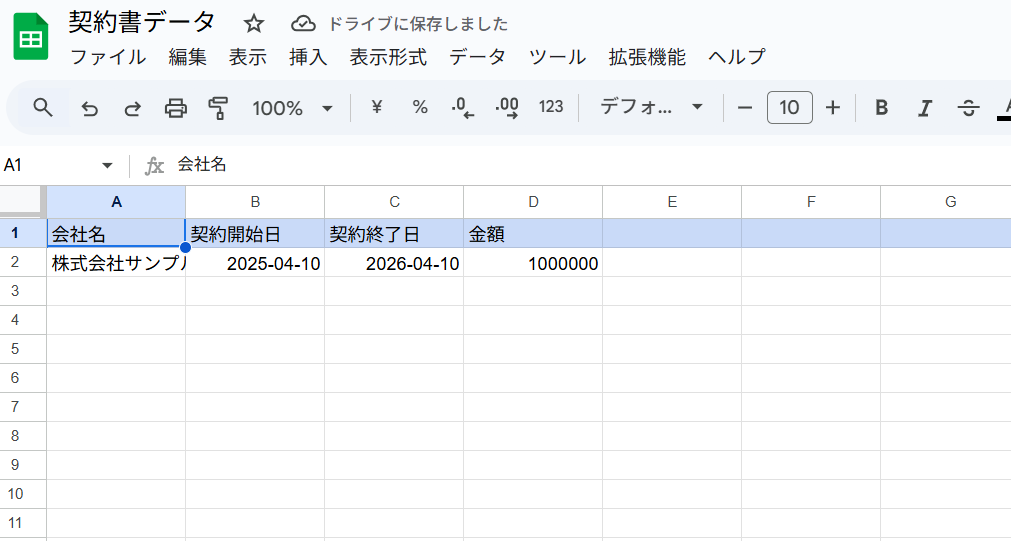 Google ドキュメントと同様に契約書を完成させるための情報の入ったGoogle スプレッドシートを事前に準備する必要があります。 なお、今回は以下のようなシートを準備しました。
