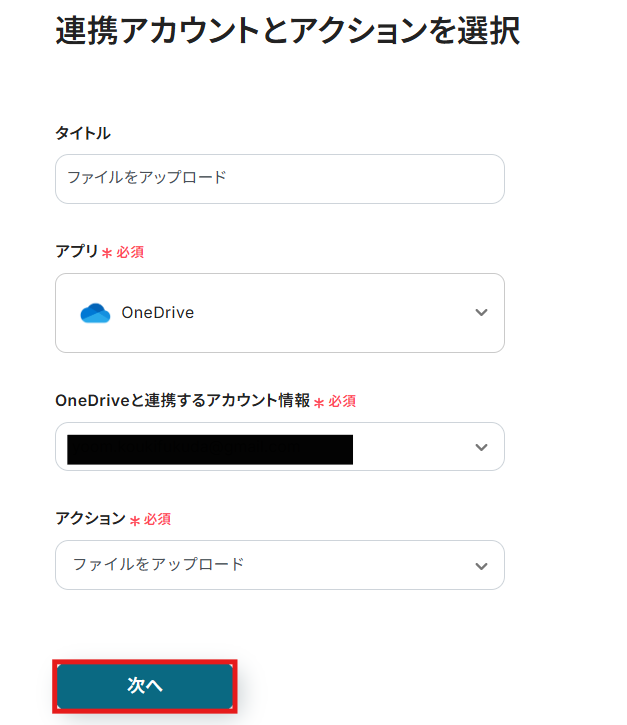 2) アクションは「ファイルをアップロードする」を選択して、「次へ」をクリックします。