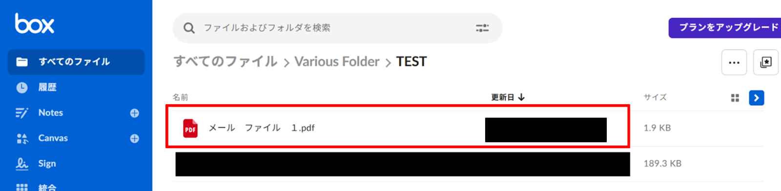 テストに成功すると、Boxの指定のフォルダにGmailのファイルが追加されました!