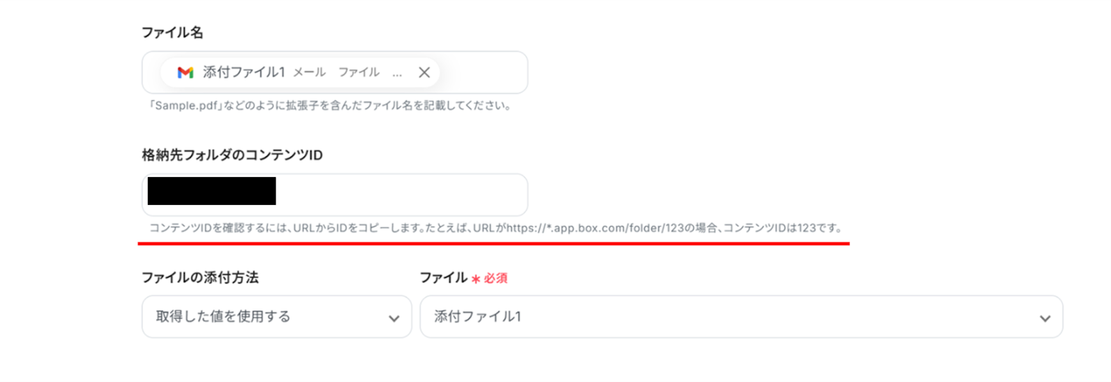 フォルダが作成できたら、赤線を確認の上、格納先フォルダのコンテンツIDを入力します。