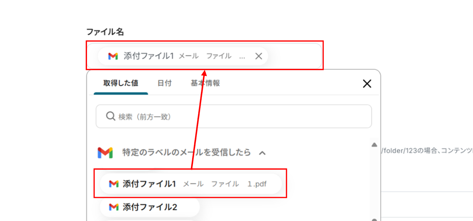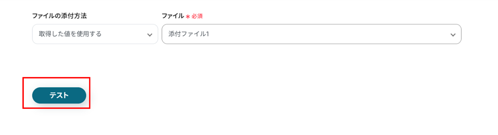 - ファイルの添付方法:「取得した値を使用する」を選択