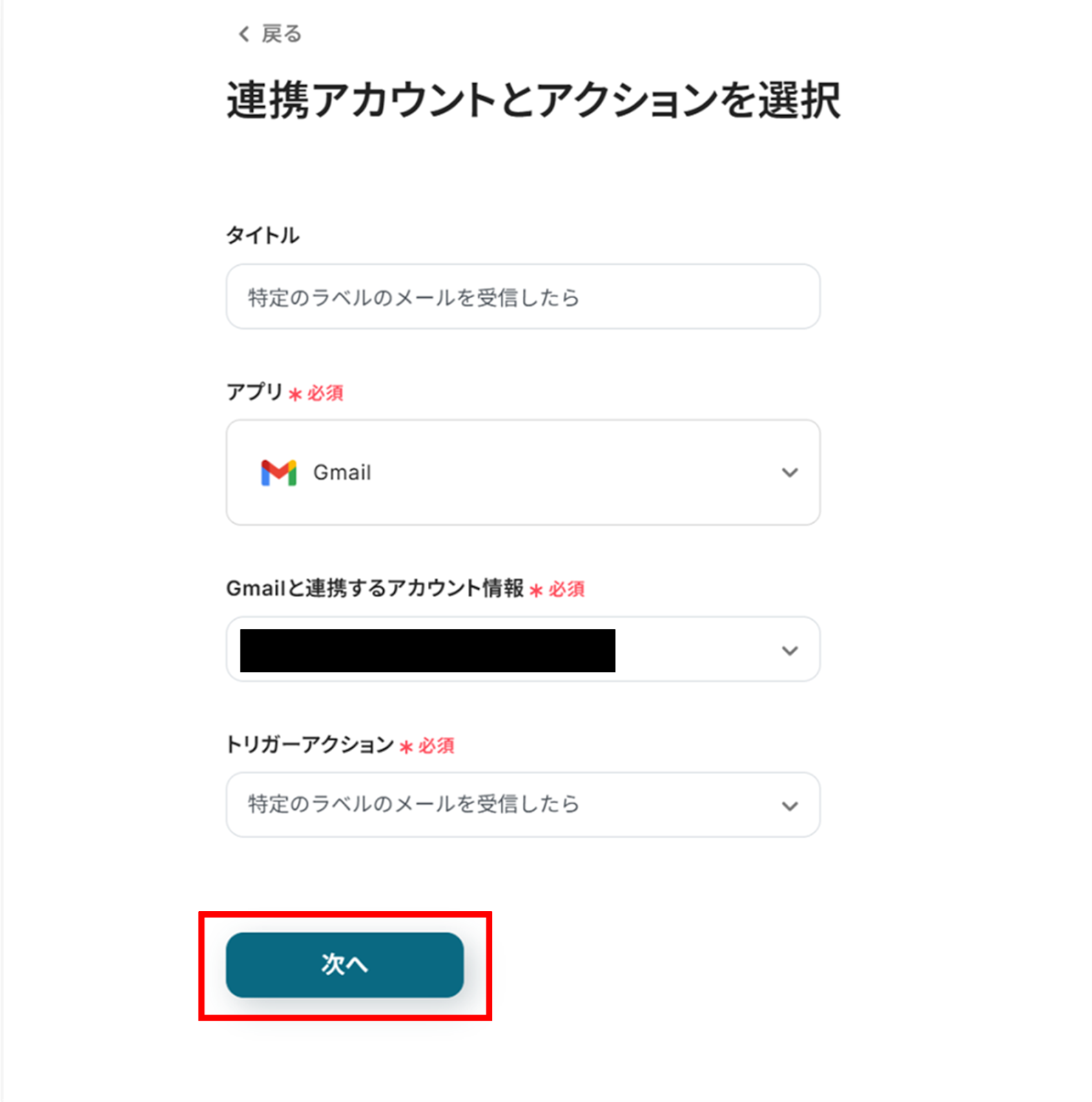 (2)Gmailの「連携アカウントとアクションを選択」画面から、Gmailと連携するアカウント情報に誤りがないかを確認し、トリガーアクションは「特定のラベルのメールを受信したら」のままで「次へ」をクリックします。