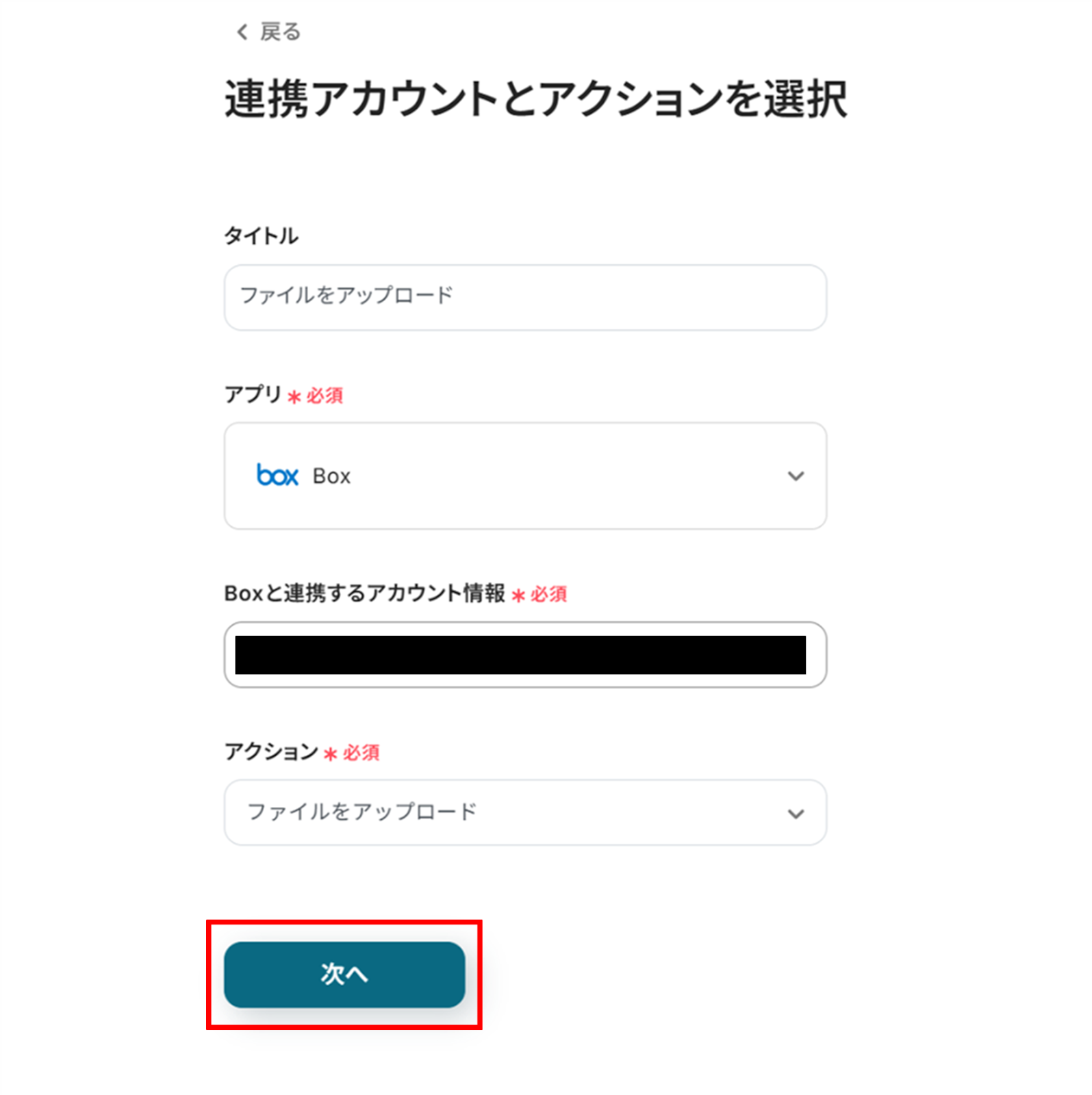(2)Boxの「連携アカウントとアクションを選択」画面から、Boxと連携するアカウント情報に誤りがないかを確認し、アクションは「ファイルをアップロード」のままで「次へ」をクリックします。