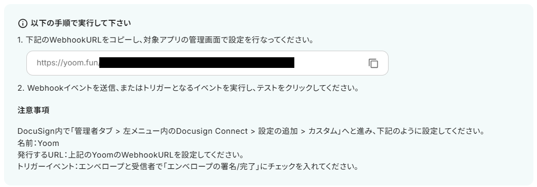 URLをコピーしたら、DocuSignの画面でWebhookの設定をしましょう。