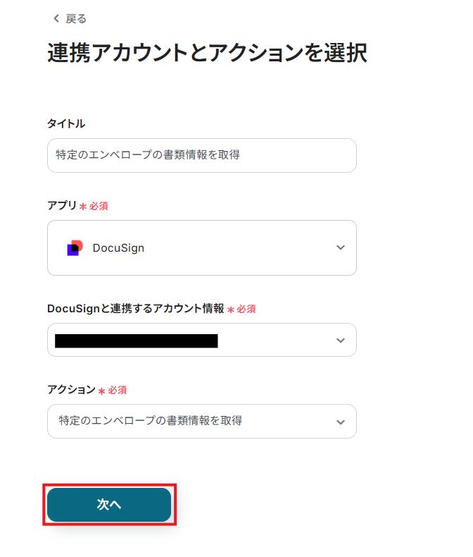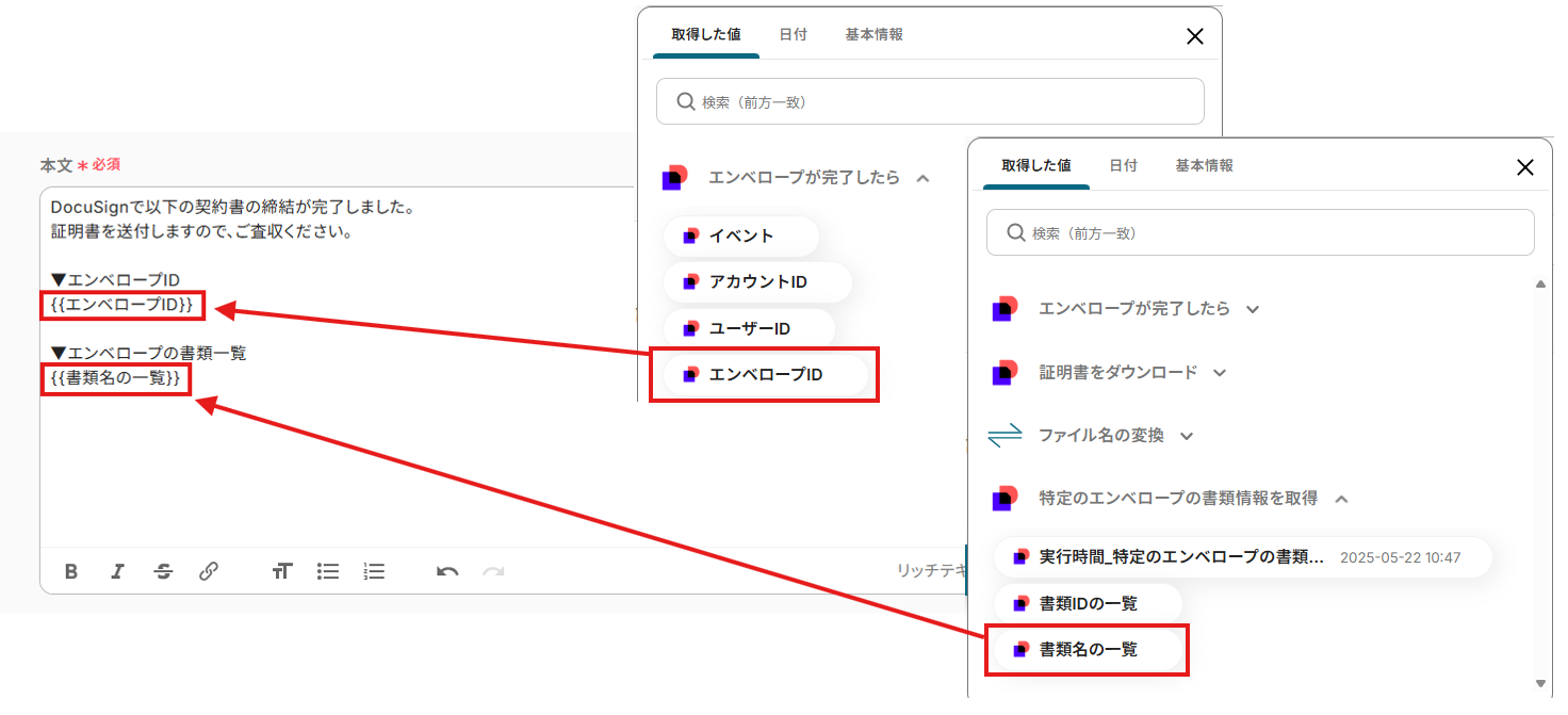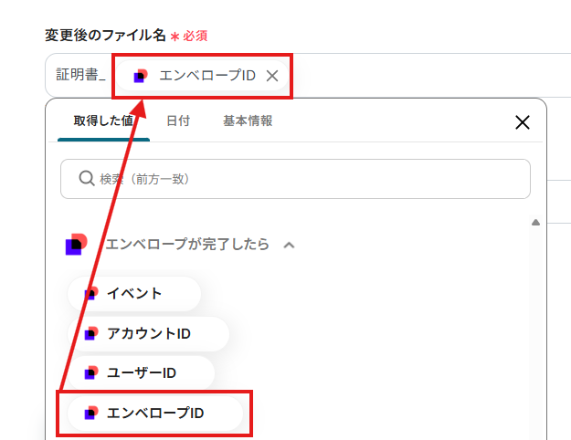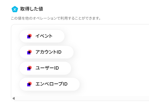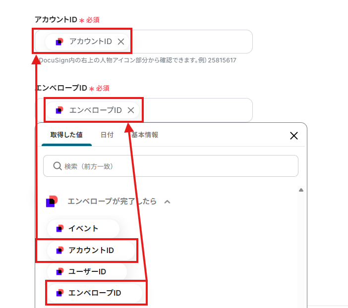 「アカウントID」「エンベロープID」は、入力欄をクリックして表示されるアウトプット(取得した値)から選択してください。