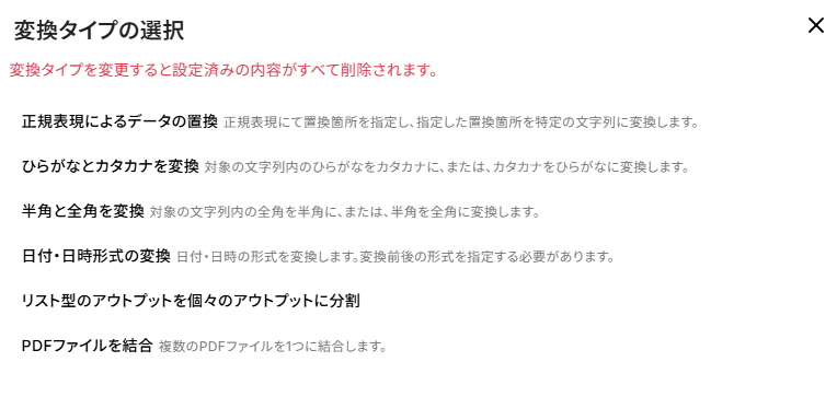 「変換タイプ」は、変更をクリックして表示されるポップアップから選択できます。