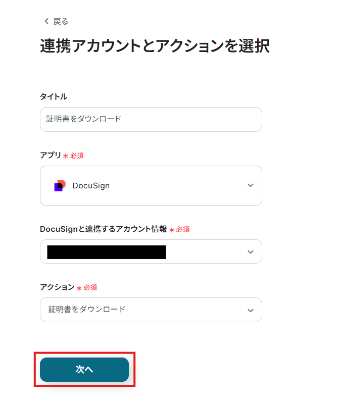 連携するアカウント情報には、ステップ1で連携したアカウント情報が反映されています。トリガーアクションはそのままにして、「次へ」をクリックしてください。