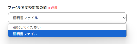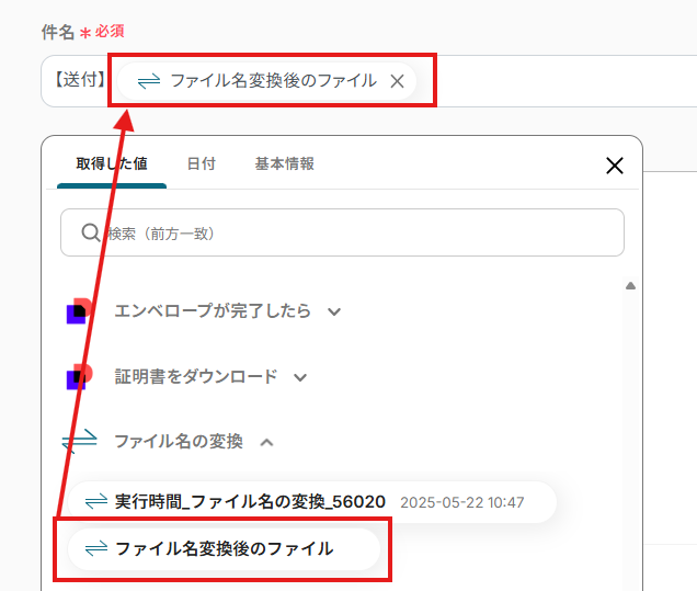 「ファイル名変換対象の値」は、プルダウンから、先ほどのステップで取得した値を選択します。
