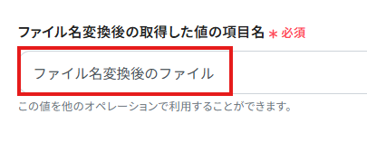 「ファイル名変換後の取得した値の項目名」は、後続の設定で使用できる「変更後のファイル名」のアウトプット(取得した値)に表示される項目名を設定します。