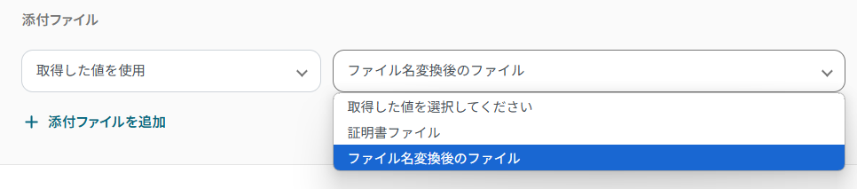 「変更後のファイル名」は、入力欄をクリックして表示されるアウトプット(取得した値)から選択できます。