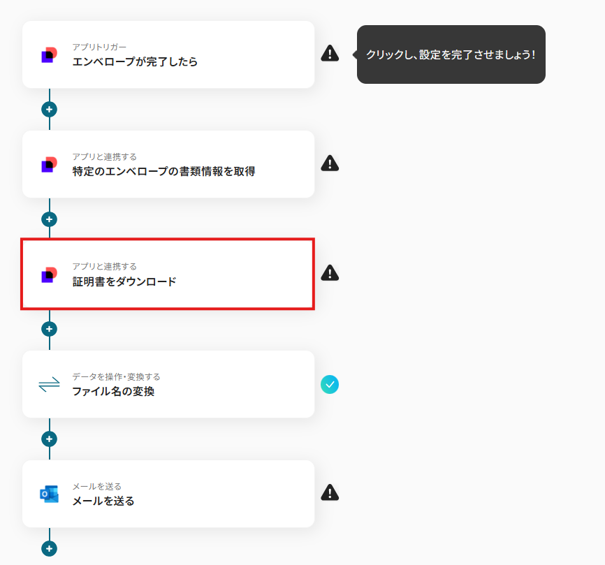 先ほどの画面で「OK」をクリックして、表示された画面のアプリトリガー「エンベロープが完了したら」をクリックしましょう。
