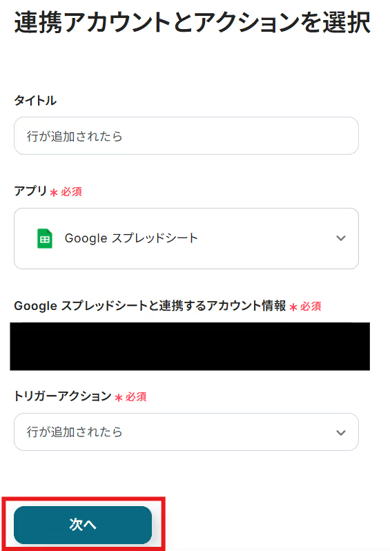 タイトルと連携するアカウント情報を確認し、トリガーアクションはテンプレート通りのまま「次へ」をクリックして進んでください。