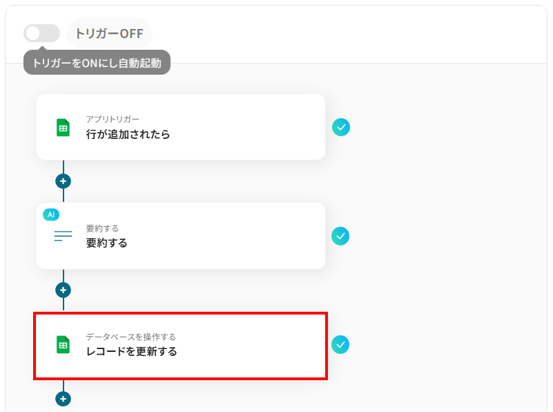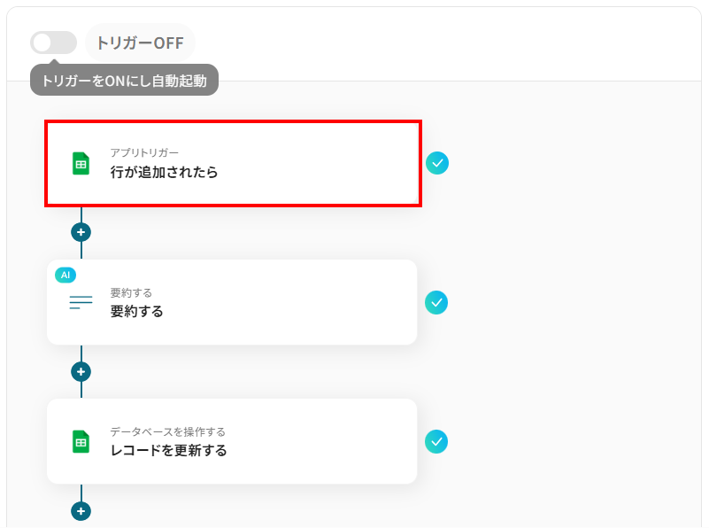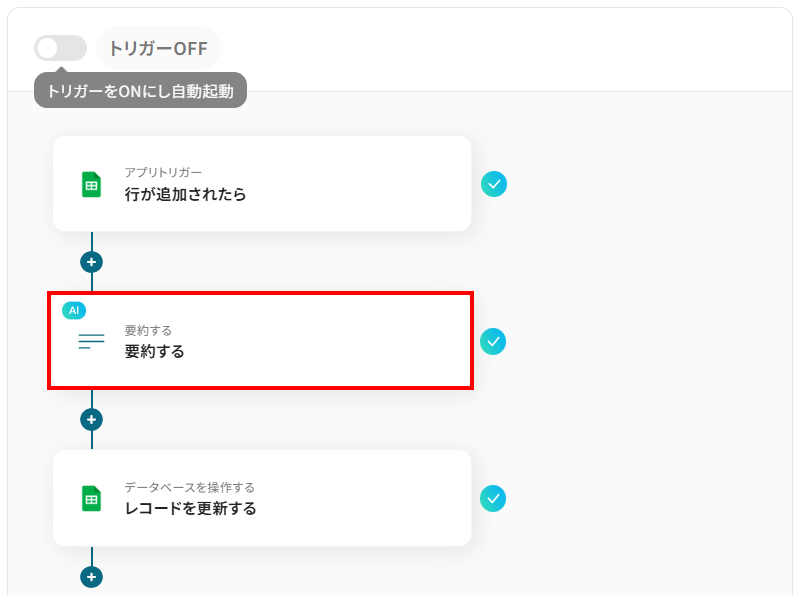 このワークフローを活用すれば、Google スプレッドシートに行が追加されるだけでAIが自動で内容を要約し、指定のセルに書き込む処理を自動化できるため、こうした情報管理の課題をスムーズに解消します。