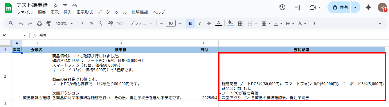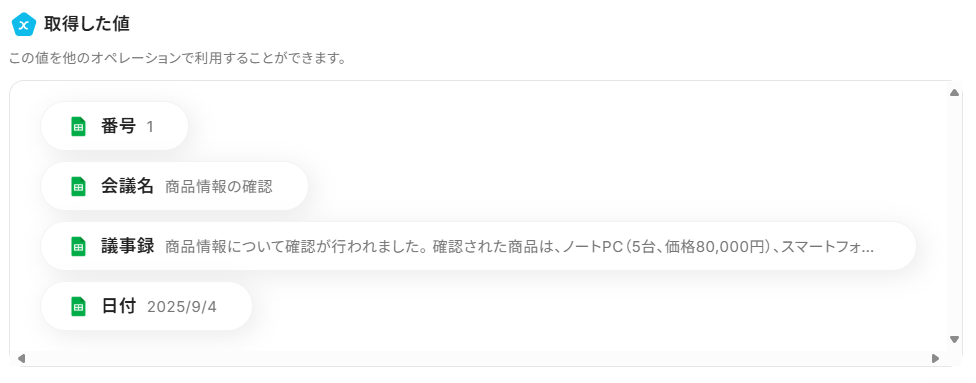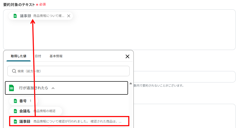 今回は、Google スプレッドシートの議事録欄に入力した内容を要約したいので下記のように設定しました。