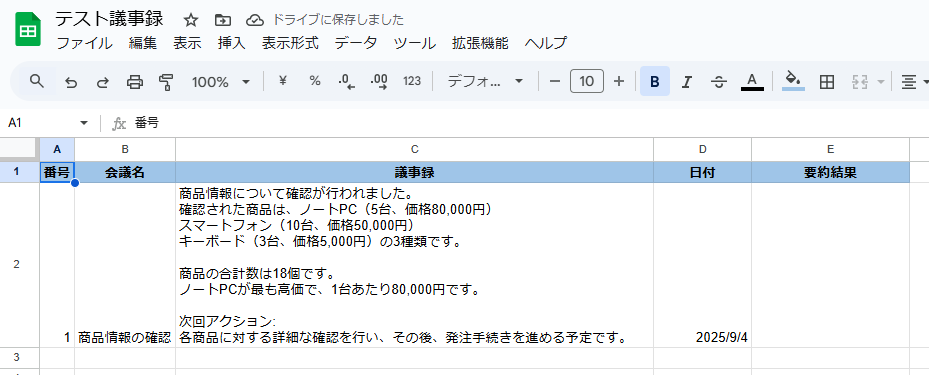 成功すると、下記のようにGoogle スプレッドシートへ要約結果が追加されているはずなので確認してください。