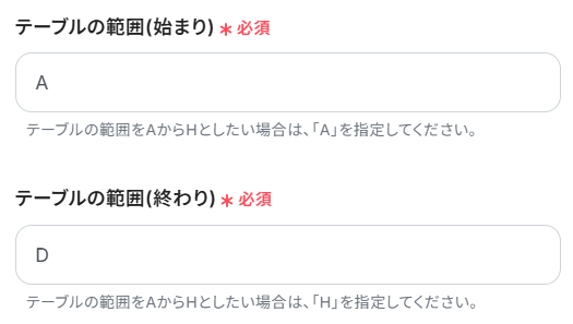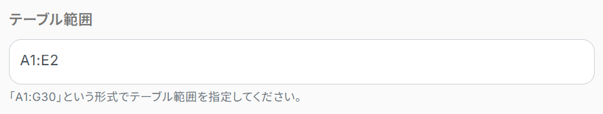 「テーブル範囲」には、Google スプレッドシートの対象となる範囲を入力してください。