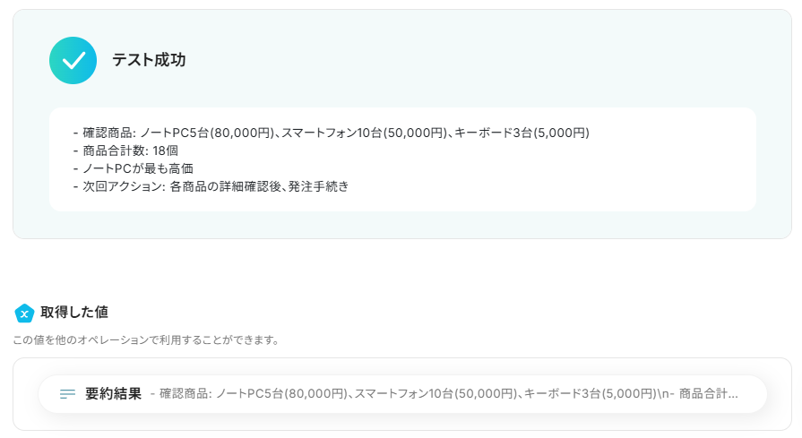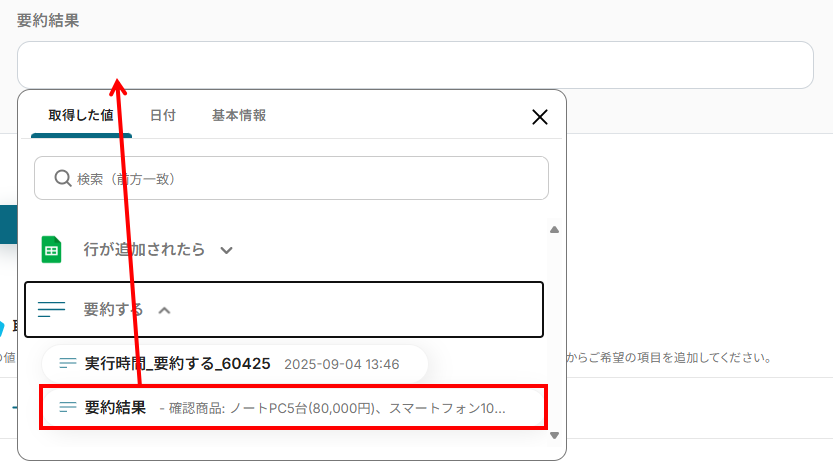 今回は「要約結果」に、前のステップで取得した「要約結果」が反映されるように設定しました。