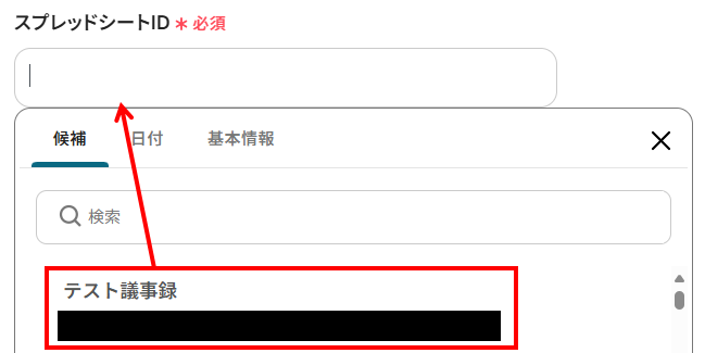 「スプレッドシートID」に、ステップ3で設定したものを選択しましょう。