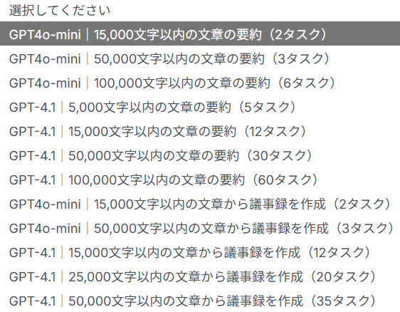また、アクション欄については「GPT4o-mini|15,000文字以内の文章の要約(2タスク)」がデフォルトで設定されています。