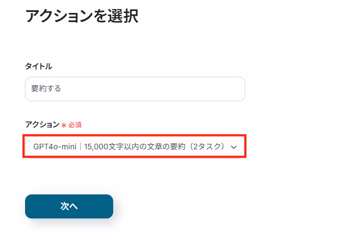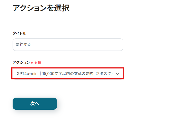 アクションを選択する画面が表示されるので必要に応じて使用するアクションを選択し、「次へ」をクリックしましょう。