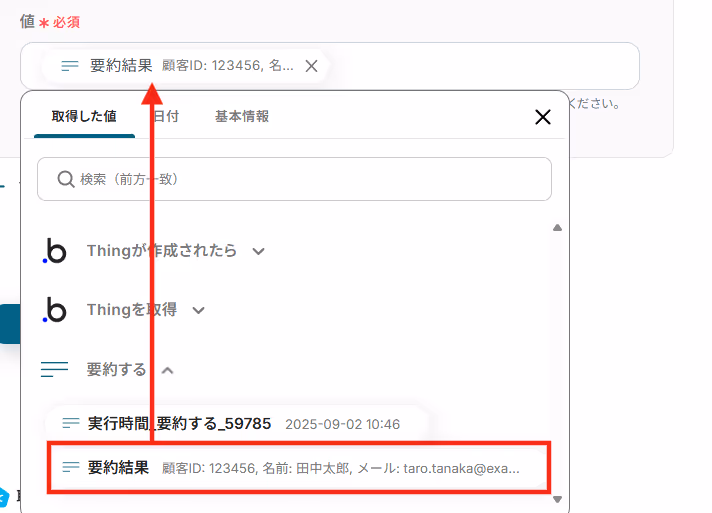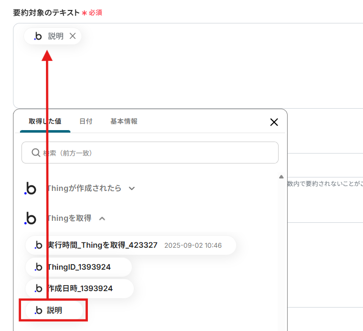 要約対象のテキストには以下のようにBubbleの「Thingを取得」の取得した値から説明をクリックし入力します。