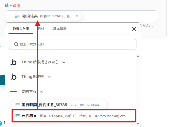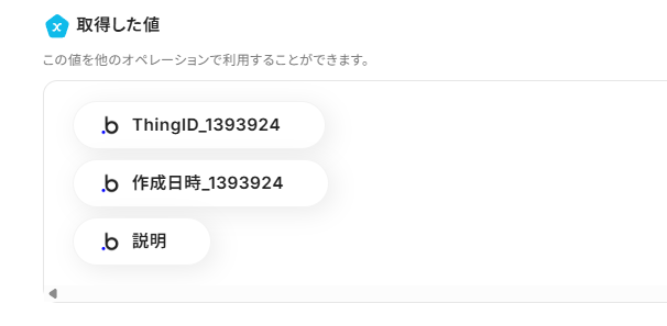 設定ができたら「テスト」をクリックし、取得した値にThingの内容が表示されているか確認しましょう。