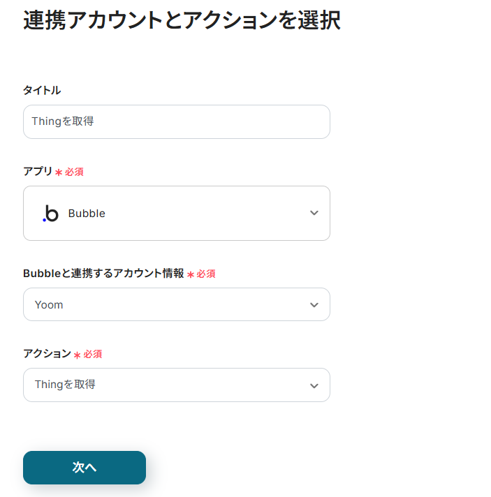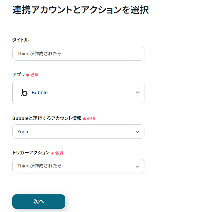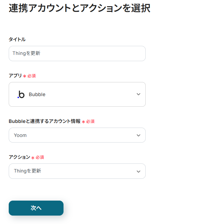連携アカウントとアクションを選択する画面が表示されるので、今回連携するBubbleのアカウントを確認し「次へ」をクリックします。