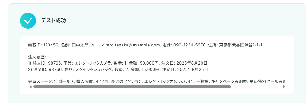 ※以下の画像は、顧客情報や商品情報を要約した際のテスト結果の一例です。