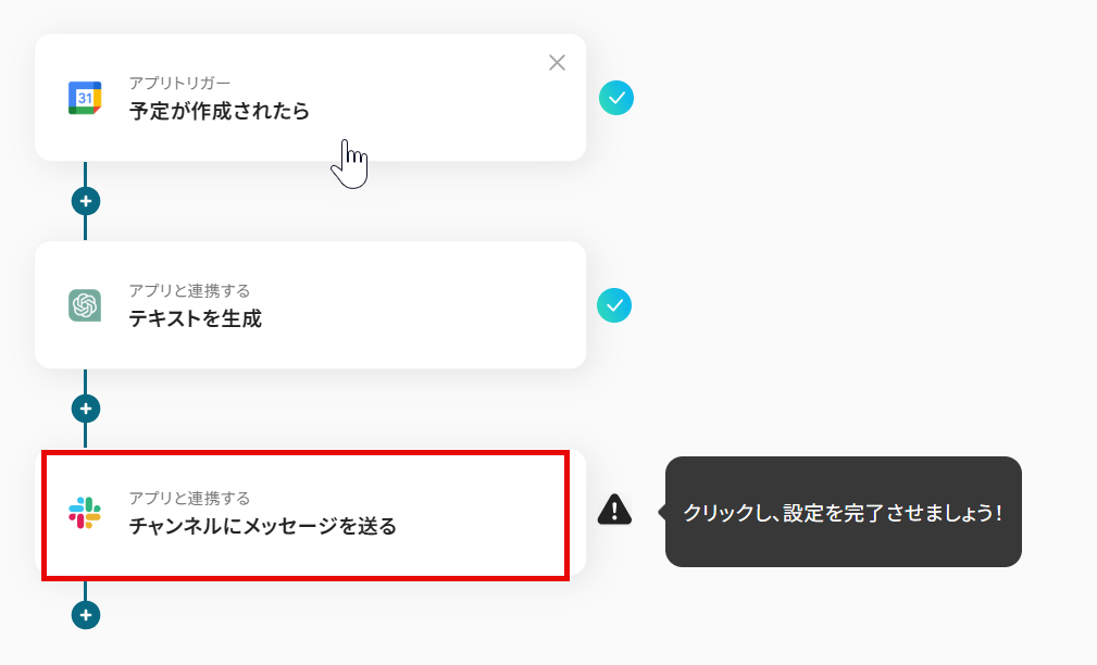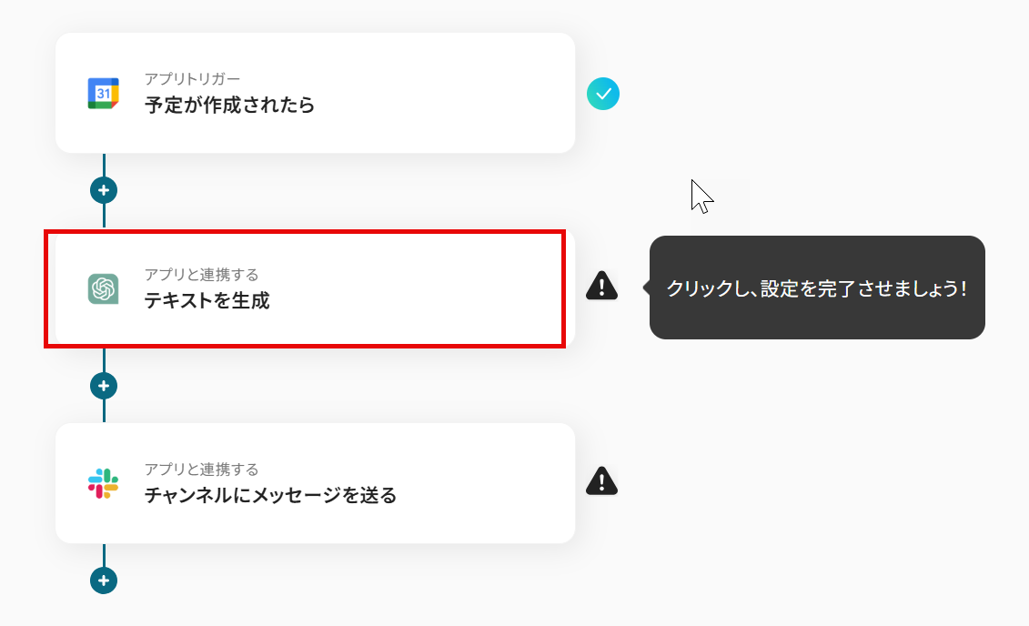 - Google カレンダーのトリガー設定とChatGPT、Slackのアクション設定