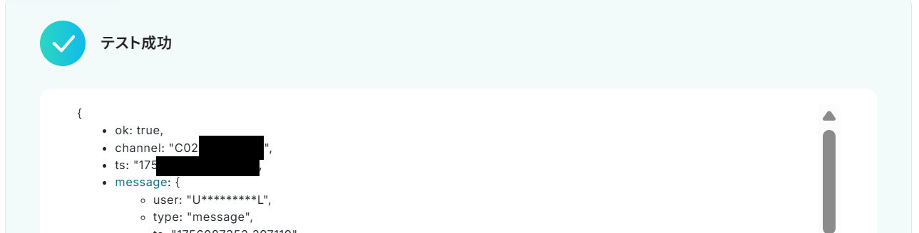 テストに成功すると以下のように表示され、Slack側に要約した説明などが通知されます。