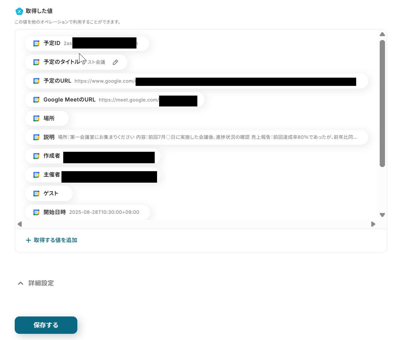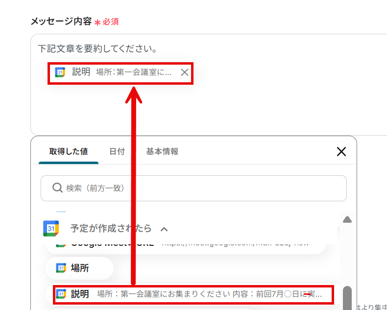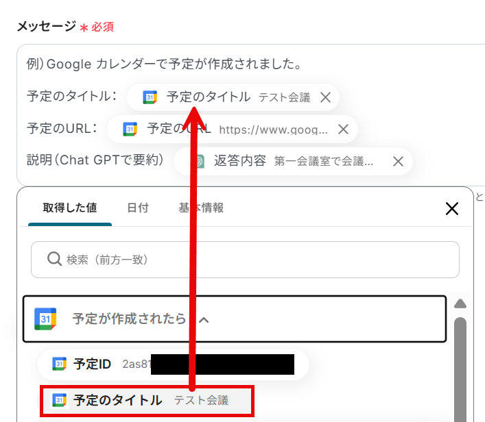 前項で取得した値から、「予定のタイトル」「予定のURL」、ChatGPTで要約した「返答内容」などを追加することができます。
