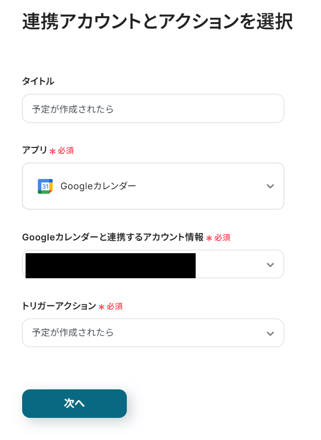 - トリガーアクション:Googleカレンダーに予定が作成されたら起動します。
