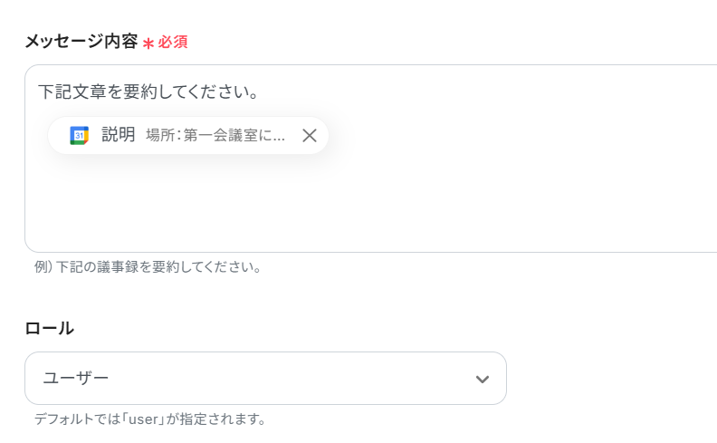 前項で取得した値から、ChatGPTで要約したテキストを作成する設定を行います。