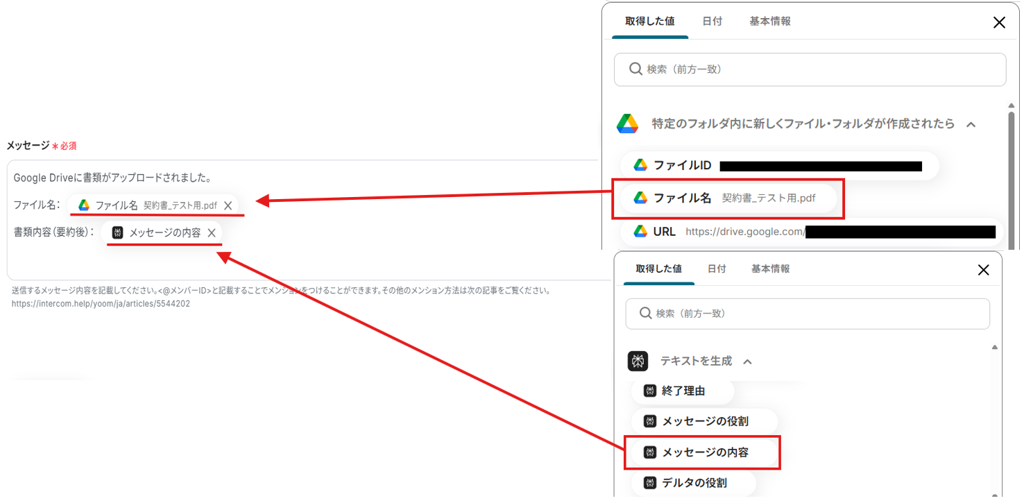 「メッセージ」は、入力欄をクリックして表示されるアウトプット(取得した値)から選択できます。