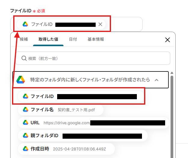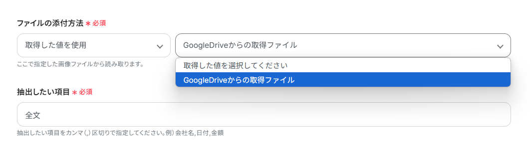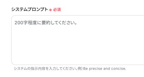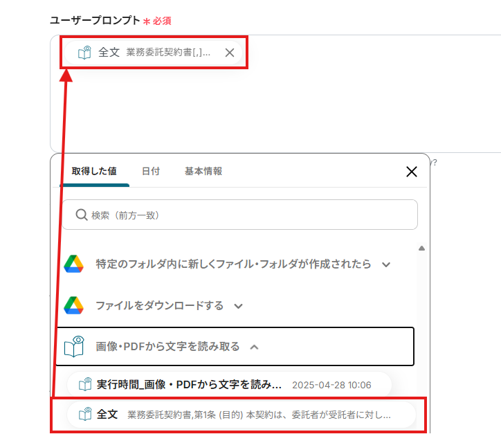 「ユーザープロンプト」は、入力欄をクリックして表示されるアウトプット(取得した値)から選択してください。