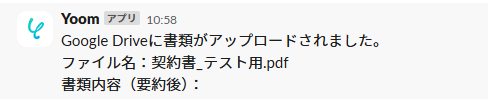※今回、Perplexityのテキスト生成のアウトプット(取得した値)が空白のため、Slackの「書類内容」部分が空白ですが、アウトプット(取得した値)に値が入っているとPerplexityで要約された内容が表示されます。