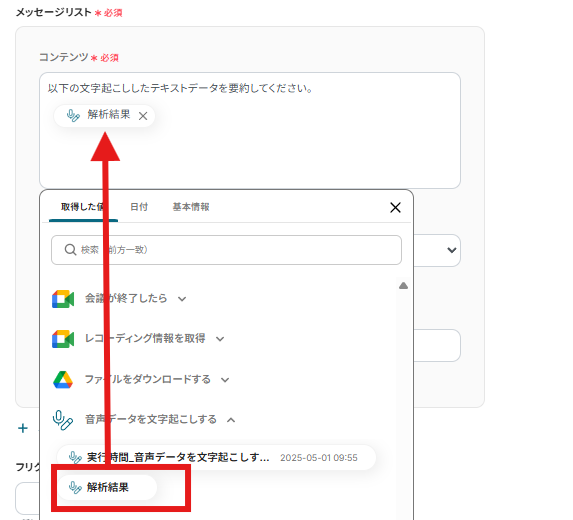 コンテンツには、DeepSeekへの指示文と、文字起こしされたテキストを入力しましょう。