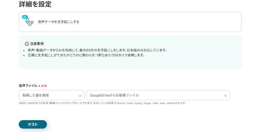 詳細を設定する画面では、GoogleDriveから取得した音声ファイルを文字起こしするように設定されています。